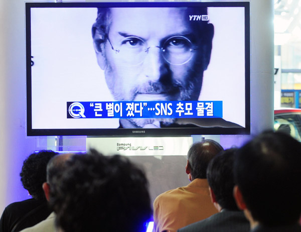 | ▲ 애플 창업자인 스티브 잡스의 사망소식이 전해진 6일 서울 용산구 동자동 서울역 대합실에서 시민들이 스티브 잡스의 사망 보도를 지켜보고 있다.(뉴시스) | ||