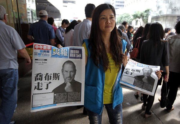 | ▲ 6일(현지시각) 중국 홍콩 거리에서 한 신문 판매원이 행인들에게 스티브 잡스의 사망을 일면 보도한 신문을 판매하고 있다. (홍콩(중국)=AP/뉴시스) | ||