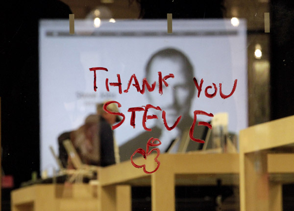 | ▲ 5일(현지시각) 미 캘리포니아주 산타모니카의 한 애플 매장 창문에 故 스티브 잡스에 보내는 메시지가 씌여 있다. (산타모니카(미 캘리포니아주)=AP/뉴시스) | ||