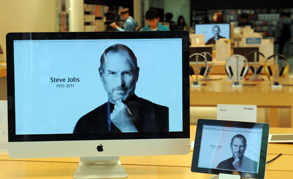 | ▲ 5일(현지시각) 미 캘리포니아주 쿠퍼티노 애플 본사에 스티브 잡스의 사진이 담겨 있는 아이패드가 꽃다발과 함께 놓여져 고인을 추모하고 있다. (쿠퍼티노(미 캘리포니아주)=AP/뉴시스) | ||
