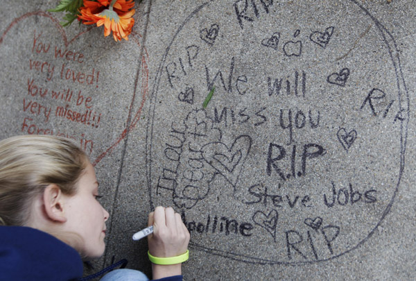 | ▲ 스티브 잡스의 이웃에 사는 한 소녀가 5일(현지시각) 미 캘리포니아주 팰러앨토 잡스의 집 앞 담벼락에 그의 죽음을 애도하는 글을 적고 있다. (팰러앨토(미 캘리포니아주)=AP/뉴시스) | ||