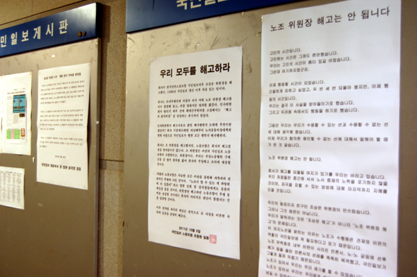 ▲ 국민일보 5층에 노조 및 편집국 기자들의 성명이 게시판에 붙어 있다. (원성윤 기자) |