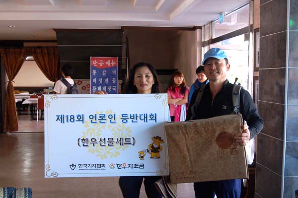▲ 등반대회 1위를 한 전라일보 김종순 기자가 한우선물세트를 들어 보이고 있다. |