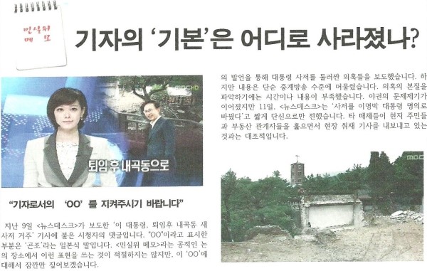 이처럼 대통령의 내곡동 사저를 둘러싼 의혹에 국민의 이목이 집중되는 동안에도 방송 3사의 카메라는 청와대와 국회의원들의 ‘입’만을 향하고 있었다. 현지 주민과 부동산 관계자 등 현장에 대한 취재는커녕 심층 분석 하나 없이 하루 한 꼭지 리포트로 소화하는 게 전부였다. 이마저도 13일 3사 저녁 메인 뉴스에선 아예 자취를 감췄다.