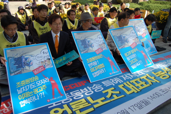 전국언론노조가 ‘조중동방송 특혜 저지와 미디어렙법 입법 쟁취를 위한 농성 투쟁’에 돌입했다. 언론노조는 ‘OCCUPY PRESS CENTER FOR PRESS FREEDOM(언론자유를 위해 프레스센터를 점령하라)’이라는 구호 아래 17일부터 21일까지를 총력투쟁 기간으로 정하고 전국 언론노조 대표자 60여명과 함께 5일 연속 농성에 들어갔다.