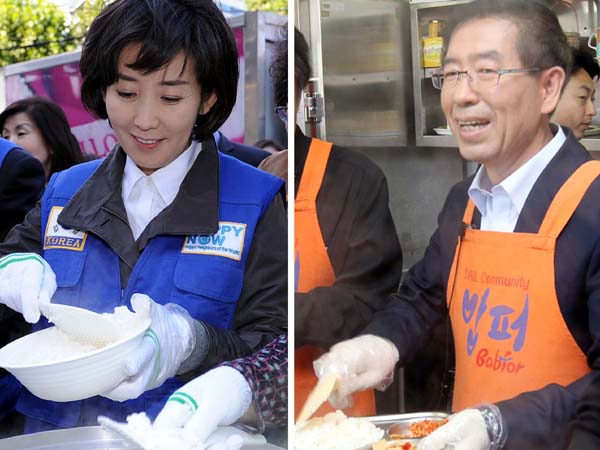 ▲ 나경원(왼쪽) 한나라당 후보와 박원순 범야권 후보가 17일 각각 서울 영등포구 영등포역 롯데시네마광장과 동대문구 답십리동 밥퍼나눔운동본부에서 봉사활동을 펼치고 있다. (뉴시스) |