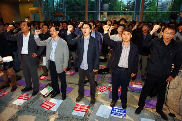 ▲ SBS노조는 지난해부터 올해 6월까지 1년 넘게 연봉제 철회 로비 농성을 벌였으나 사측과 대화는 난항이었다. 사진은 지난 5월 로비 농성 1주년을 맞아 노조가 주최한 집회 장면. |