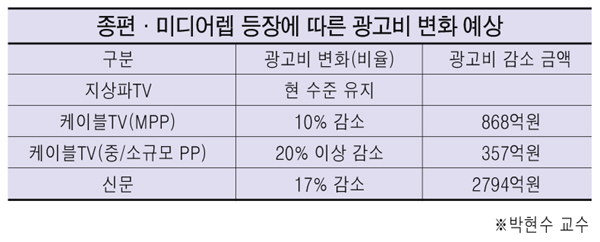 MPP(복수채널사용사업자)와 지상파계열 PP는 약 10%, 중소규모 PP는 17~20% 하락할 것으로 전망했다. 지상파TV는 현 수준을 유지할 것으로 예측했다. 박 교수는 “종편이 등장해도 광고비 규모는 성장하지 않고 다른 쪽으로 이동할 것”이라며 “대략 3500억~4000억원 정도의 광고가 종편 쪽으로 빠질 것으로 본다”고 말했다.