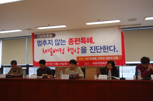 ▲ ‘멈추지 않는 종편특혜, 채널배정 협상을 진단한다’ 긴급토론회가 미디어행동과 정장선 민주당 의원 공동 주최로 지난 27일 국회 의원회관에서 열렸다. |