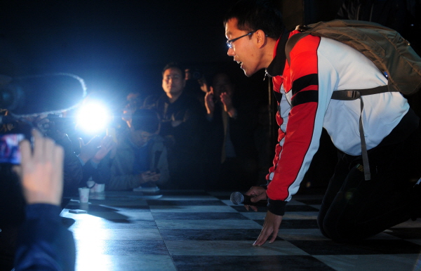 | ▲ 서울시장 보궐선거가 무소속 박원순 후보의 승리로 당선 확정된 지난달 27일 새벽 방송인 김제동씨가 서울광장을 찾아 박 후보의 지지자들과 함께 당선 축하 발언을 하고 있다.(뉴시스) | ||