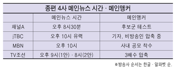 종편4사의 메인뉴스 앵커를 누가 맡을지도 관심사다. TV조선은 조선일보, TV조선, 외부인사 각 1명씩 3명을 후보군으로 압축했다. jTBC는 보도국 내·외부 기자, 비방송인 등을 놓고 후보군을 압축하고 있다. MBN은 보도국 기자를 대상으로 공모에 들어갔고 채널A는 후보군을 테스트하고 있다.