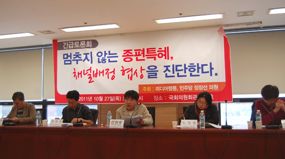 ▲ ‘멈추지 않는 종편특혜, 채널배정 협상을 진단한다’를 주제로 한 긴급토론회가 미디어행동과 정장선 민주당 의원 공동 주최로 지난달 27일 국회 의원회관에서 열렸다. |