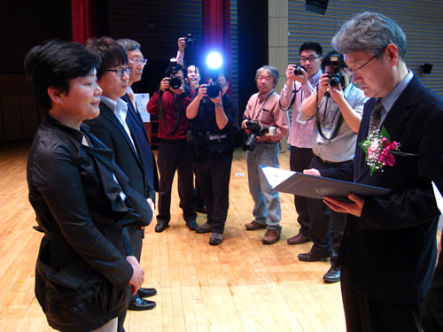 ▲ ‘2011 지역신문 컨퍼런스’ 문화부장관상 수상자들이 심장섭 문화부 미디어정책국장(사진 오른쪽)에게 상패와 상금을 수여받고 있다. |