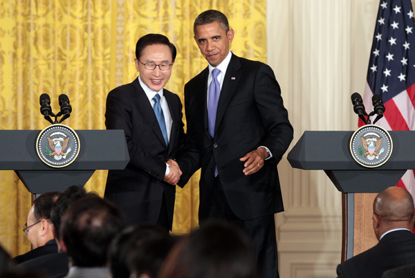 ▲ 이명박 대통령과 오바마 미국 대통령이 지난달 13일 미 워싱턴 백악관에서 공동 기자회견을 열어 한·미 FTA 비준처리를 약속했다. (연합뉴스=청와대 제공) |