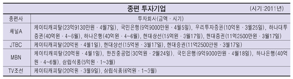 이 밖에 삼립식품이 MBN 5억원, TV조선에 6억원을 투자했으며 현대상선은 채널A와 JTBC에 각각 15억원, 현대증권도 두 회사에 11억2500만원을 투자했다.