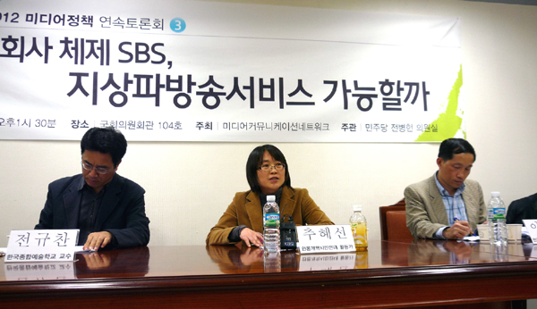10일 미디어커뮤니케이션네트워크 주최로 열린 ‘지주회사 체제 SBS, 지상파방송서비스 가능할까’에 관한 토론회에서 추혜선 언론개혁시민연대 활동가는 “SBS 지주회사를 통해 지주회사 체제의 폐해가 명백하게 드러났다”며 “지상파 방송사와 종합편성, 보도전문채널에 대해서는 지주회사를 통한 지배를 금지하는 것이 필요하다”고 주장했다.