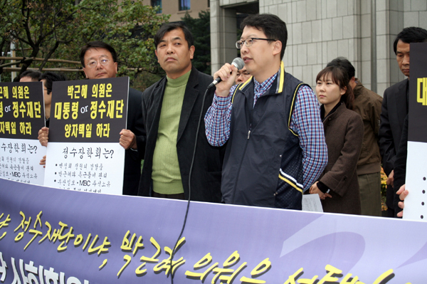 이강택 언론노조위원장은 “박 의원이 그토록 수첩에 적고 다닌다는 ‘원칙’은 자신의 이해관계와 동떨어진 곳에서만 적용되는가”라고 물으며 “자신의 소신에 맞게 정수재단을 깔끔하게 포기하라”고 촉구했다.
