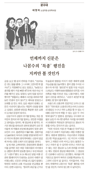 배 논설위원은 칼럼에서 “신문의 위기의 원인을 따져보면 외부의 환경적 요인 못지않게 제 역할과 본분에 충실하지 못한 내적 요인이 크다”며 “불편부당, 정론직필로 독자의 신뢰를 얻었더라면 아무리 미디어 환경이 천지개벽해도 신문이 발길에 차이는 깡통 신세가 되진 않았을 것”이라고 했다.