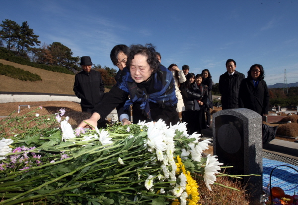 | ▲ 고(故) 리영희 선생 1주기 추모식이 열린 5일 오후 광주 북구 운정동 국립 5·18민주묘지에서 리 선생의 부인 윤영자(79)씨가 고인에게 술잔을 올리고 있다.(뉴시스) | ||