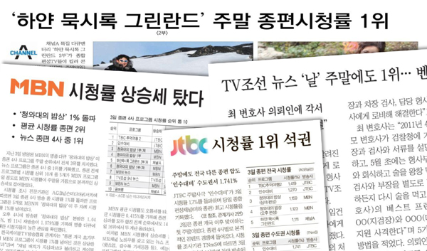 종편 띄우기는 시청률 관련 기사를 일제히 낸 5일자 신문에서 두드러졌다. “JTBC 시청률 1위 석권”(중앙 1면), “TV조선 뉴스 ‘날’ 주말에도 1위…벤츠 여검사 연일 특종”(조선 1면), “‘하얀 묵시록 그린란드’ 주말 종편시청률 1위”(동아 2면), “MBN 시청률 상승세 탔다”(매경 2면) 등이다.