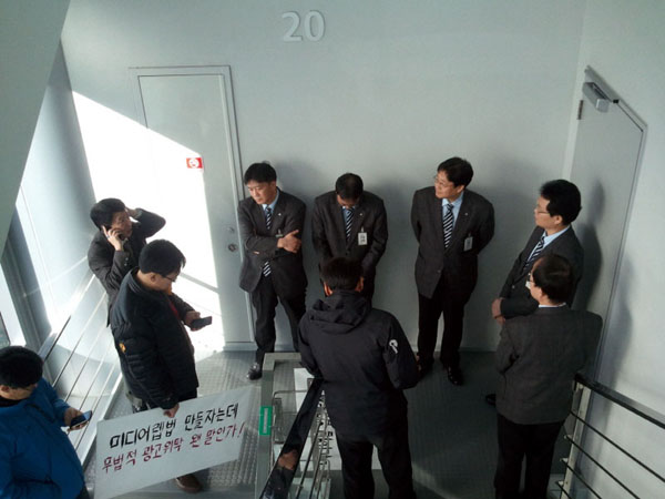 ▲ SBS노조 조합원들이 5일 SBS이사회가 열리는 사옥 20층으로 연결되는 비상 계단에서 사측 관계자들과 대치하고 있다. (SBS노조 제공) |