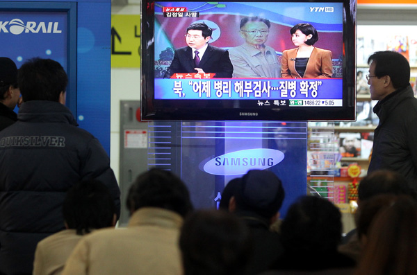 ▲ 김정일 국방위원장이 과로로 열차에서 사망했다는 조선중앙통신의 보도가 나온 19일 경기 수원역에서 시민들이 TV를 통해 뉴스속보를 관심있게 살펴보고 있다. (뉴시스) |