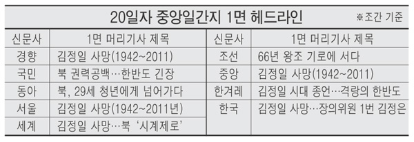 20일 중앙일간지 지면은 대부분 김정일 북한 국방위원장의 사망과 관련한 기사로 채워졌다. 3분의 1이 넘는 13~18개면 안팎의 지면을 할애해 김 위원장의 사망원인, 김정은 권력 승계 전망, 정부 대응, 국제사회 반응, 금융시장 전망, 전문가 진단 분석 등을 실었다.