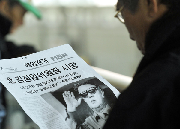 ▲ 김정일 국방위원장의 사망 소식이 전해진 19일 오후 서울 동대문역사문화공원역 인근에서 한 시민이 사망소식을 전하는 호외를 보고 있다. (뉴시스) |