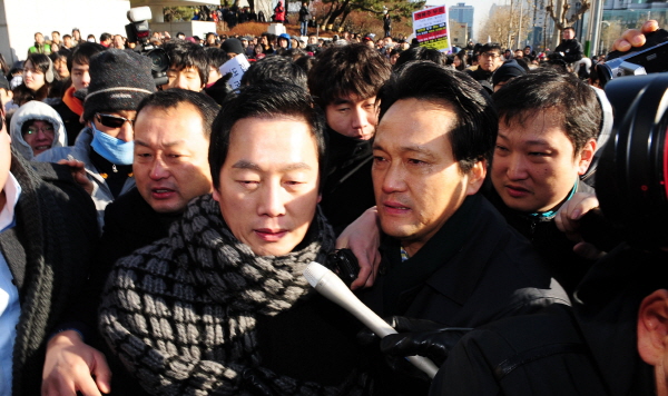| ▲ BBK 허위사실 유포 혐의로 기소된 정봉주 전 민주당 국회의원이 22일 오전 서울 서초구 대법원에서 열린 상고심선고에서 징역1년을 확정 받은 뒤 지지자들과 취재진들에게 둘러 쌓이고 있다.(뉴시스) | ||