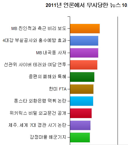 이밖에 한미FTA 보도는 6위, 론스타 외환은행 먹튀 논란은 7위를 차지했다. 위키리크스 비밀 외교문건 공개, 제주도 ‘세계 7대 자연경관’ 선정 사기 논란, 강정마을 해군기지 문제 등도 10위권 안에 포함됐다. UAE 원전 수주의 실체, 저축은행 로비, 한진중공업 사태와 희망버스 등의 사건도 50% 안팎의 높은 응답률을 나타냈다.
