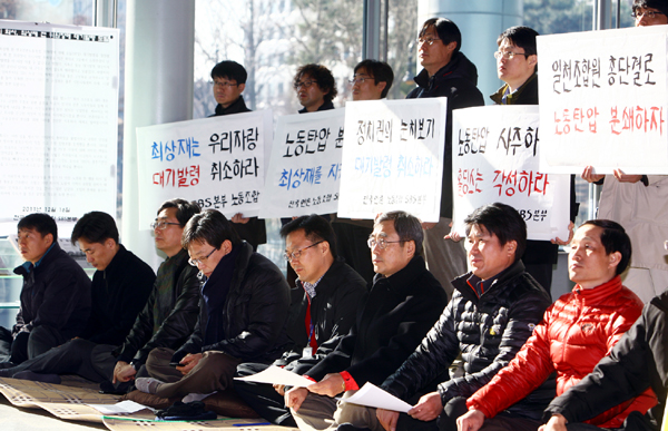 올 들어 가장 추운 날씨였다는 26일, 최상재 전 전국언론노조 위원장은 서울 목동 SBS 사옥 1층 로비에서 무기한 점심 단식 농성에 들어갔다. 그는 미디어법 총파업 건에 대한 법원의 2심 유죄 판결을 이유로 취해진 사측의 대기발령을 철회하라는 요구를 내걸었다.