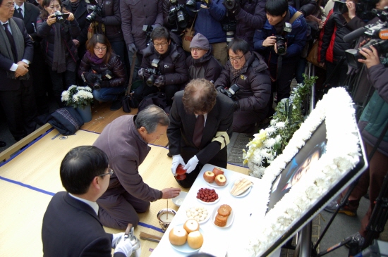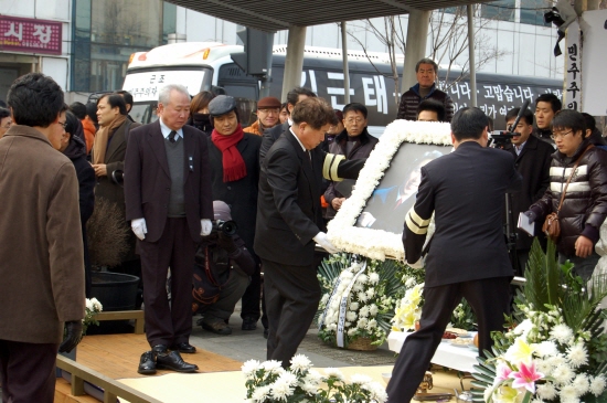 전태일 열사의 동상 앞에서 10여 분간 진행된 노제는 참석자들의 묵념을 끝으로 마무리됐다. 이날 노제에는 신문·방송·인터넷 등 기자 50여명이 고인의 마지막 길을 카메라와 수첩에 담았다.