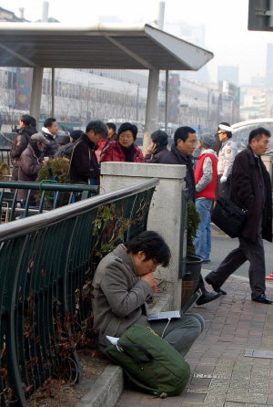 | ▲ 영하 10도의 추운 날씨 탓에 한 기자가 손에 입김을 불어넣으며 전태일 다리 옆에 쭈그려 앉아 기사를 쓰고 있다. (원성윤 기자) | ||