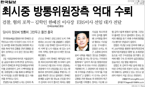한국일보가 한국방송예술진흥원 김학인 이사장이 EBS 이사 선임 로비를 위해 방송통신위원회 최고위층 측에 억대 금품을 건넨 정황을 검찰이 포착하고 수사 중인 것으로 확인됐다고 2일 보도했다.