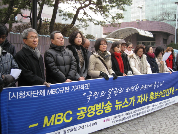 ▲ 시청자단체들이 9일 오전 여의도 MBC 앞에서 기자회견을 열고 MBC 뉴스가 자사이익을 위한 협박 수단으로 변질됐다고 성토했다. |
