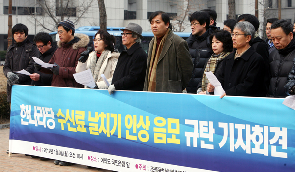 ▲ 전국언론노조와 미디어행동 등이 9일 여의도 국회 앞에서 기자회견을 열고 한나라당의 미디어렙법과 수신료 인상안 연계 처리 시도를 비판하며 조속한 입법을 촉구했다. (언론노조 제공) |