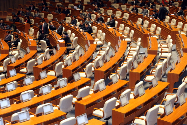 ▲ 13일 오후 서울 여의도 국회에서 열린 본회의에 한나라당 소속 의원들이 불참하자 민주통합당이 단독으로 개의한 가운데 본회의장 안 한나라당 소속 의석 곳곳이 빈채로 회의가 진행되고 있다.(뉴시스) |