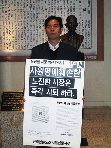 | ▲ 서울신문 노조 김성수 위원장이 2008년 11월 10일, 서울신문사 1층 로비에서 이른바 ‘형님편지’로 물의를 빚은 노진환 사장의 사퇴를 촉구하는 1인 시위를 벌이고 있다. (기자협회보 자료사진) | ||