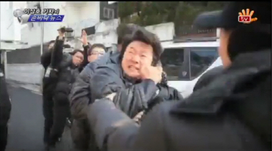 | ▲ 전두환씨 사저를 취재하던 이상호 MBC 기자가 경찰들에 의해 끌여 나오는 모습 ⓒ손바닥TV | ||