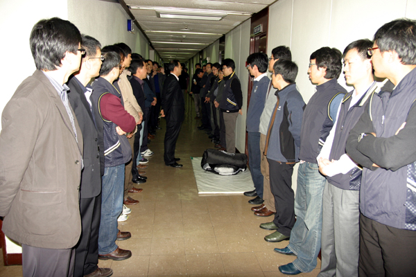 ▲ 부산일보 기자들이 지난해 11월29일 오전 소집된 이정호 편집국장 징계위원회를 몸으로 막아 무산시켰다. (전국언론노조 부산일보지부 제공) |