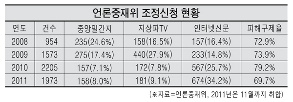 중재위 조정신청 처리현황을 살펴보면 2009년부터 신청건수가 가파르게 증가하고 있다. 이는 2009년 7월 개정된 언론중재 및 피해구제에 관한 법률이 일부 개정되면서 인터넷신문 등에 대한 조정신청이 급증한 탓이다.