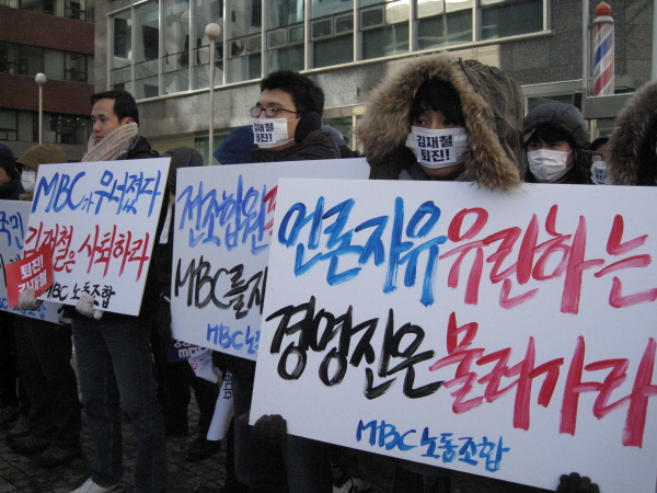 | ▲ MBC노조 조합원들이 1일 오후 방문진 앞에서 김재철 사장 퇴진을 촉구하는 집회를 열고 있다. | ||