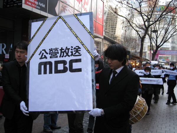 김재철 사장 퇴진과 공영방송 정상화를 위한 파업 중인 MBC노동조합이 파업 닷새째를 맞아 거리로 나가 시민들을 만났다. MBC노조는 3일 오후 명동예술극장 앞 거리에서 ‘죽은 MBC를 위한 노제’를 지내고, 공영방송 MBC를 다시 국민의 품으로 돌려놓을 것을 다짐했다.