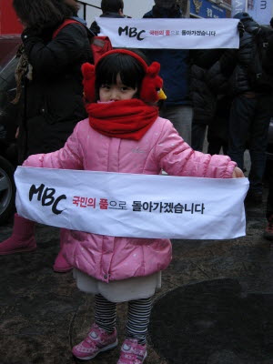 ▲ 한 어린 아이가 'MBC 국민의 품으로 돌아가겠습니다'라고 쓰인 펼침막을 들고 있다. |