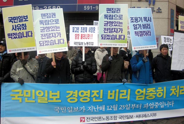 노조는 14일 오전 서울 서초동 법원 앞에서 검찰 수사와 재판 중인 조용기 국민일보 회장 및 조민제 사장에 대해 사법처리를 촉구하는 집회를 열었다. 이날은 전국언론노조와 연대한 첫 집회였다.