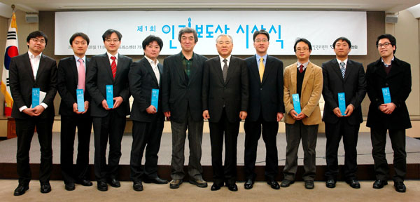 ▲ 제1회 인권보도상 시상식 참석 인사들과 수상자들이 포즈를 취했다. 왼쪽부터 우한울·이승준 KBS광주방송총국 기자, 오승재·박용필 EBS 기자, 김주언 심사위원장, 현병철 국가인권위원장, 박종률 한국기자협회장, 김대휘 제주CBS기자, 박종찬·권오성 한겨레신문 기자. |
