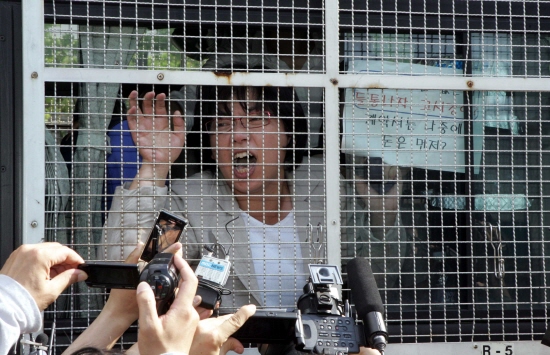 ▲ 지난 2008년 6월25일 이정희 민주노동당 의원이 서울 내자동 경복궁역 주변에서 경찰이 정부의 미국산 쇠고기 고시 강행을 규탄하는 시민들을 연행하는 것을 만류하다 연행되면서 경찰버스 안에서 '고시 철회'를 외치고 있다. |