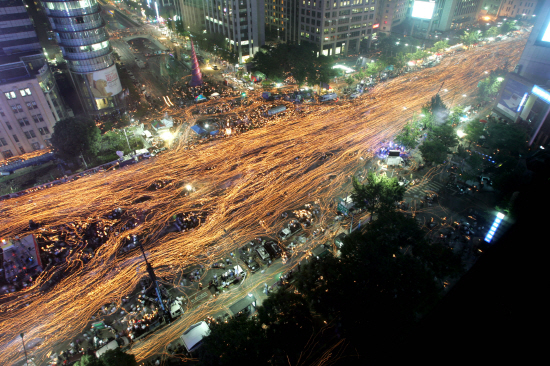 ▲ 6·10 100만 촛불대행진이 열린 2008년 6월10일 저녁, 광화문 도로를 가득 메운 시민들이 촛불을 치켜든 채 '쇠고기 전면 재협상'을 외치고 있다. |