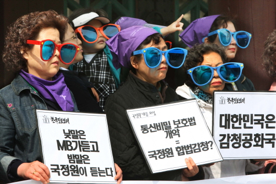 ▲ 민주화실천가족운동협의회 소속 회원들이 23일 오후 서울 종로3가 탑골공원 들머리에서 인권, 신민, 사회단체 회원들과 함께 연 '목요집회'에서 권력기관의 감시를 상징하는 색안경을 낀 채 '통신비밀보호법 개악' 움직임을 비판하고 있다. |