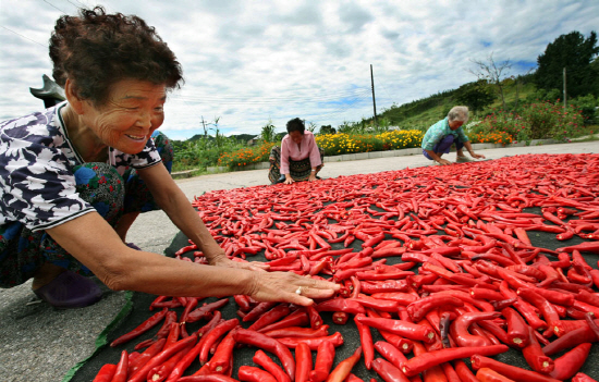 ▲ 경기도 파주시 탄현면 오금리에서 황순희 할머니가 빨갛게 익은 고추를 햇살에 말리고 있다. |